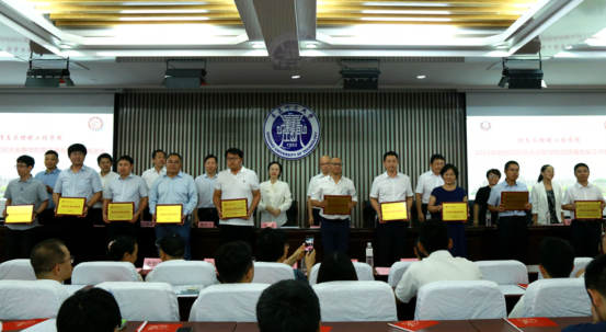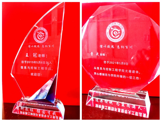颁奖结束后,学院为近5年新入职教师和荣休教师代表颁发纪念奖杯。这些奖杯从暑假前就开始设计制作,倾注了学院的美好祝福和真诚期待,每个奖杯上除了印制院徽院训外,还印制了每一位新入职教师的姓名和入职日期,以及每一位荣休教师的姓名和退休日期。新入职教师的奖杯是帆船造型,寓意锐意进取、开拓创新、破浪前行,荣休教师的奖杯是八边形造型,寓意四平八稳、庄重吉祥、平安健康。