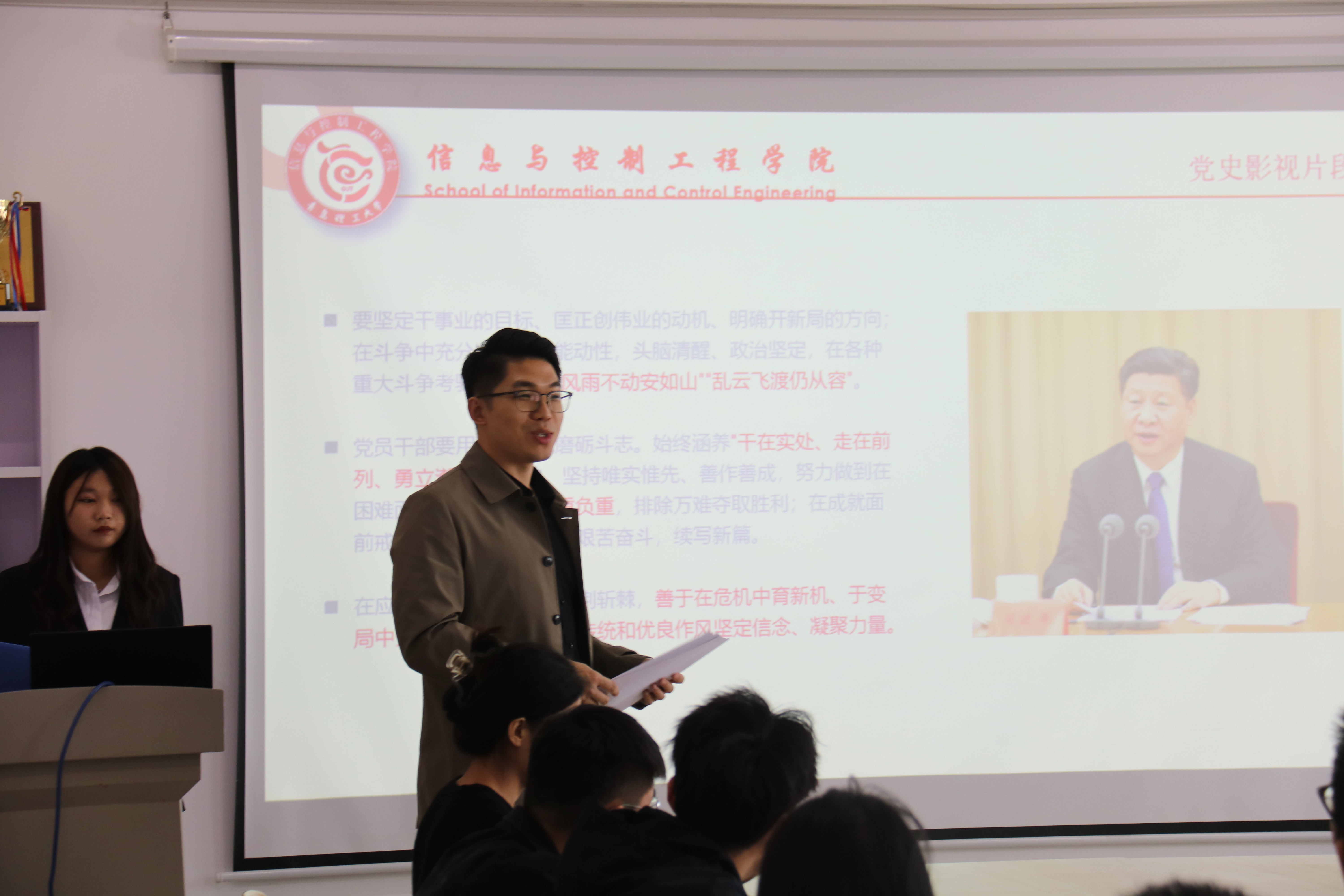 首先,李登超讲解本次活动的概述,自党的十八大以来,习近平总书记高度重视红色资源的保护、管理和运用。师生共同观看党史影视片段视频,跟随历史路迹,领悟先辈们筚路蓝缕的革命精神,见证祖国繁荣富强的脚步。青年学生责任在肩,更应奋勇向前,不畏困难和挑战,不负期望,不负时代。