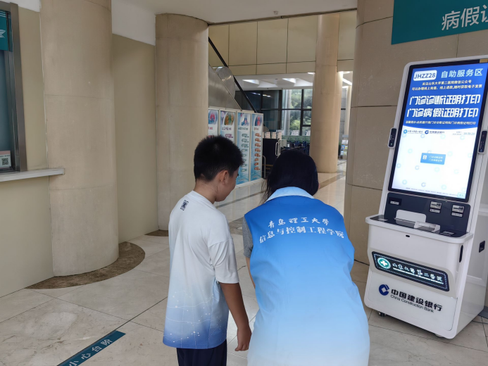 在工作人员的带领下,调研队参观了医院医保服务大厅的政策宣传区。随后,团队成员现场学习了跨省异地就医的全流程,化身政策讲解员,作为志愿者现场引导就医人员办理手续,从线上备案操作、门诊挂号到检查单审核、费用结算,成员们每一步都耐心指导。靳淑颖在体验后说:“从‘纸上流程’到‘亲身体验’,才真正明白政策落地需要多部门协同,民生服务真的要‘细之又细’。”通过实地服务,团队成员对异地医保有了更加清楚地认识。