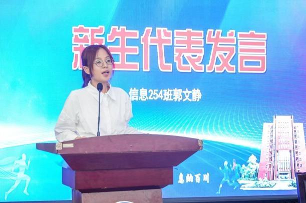 本科新生代表、2025级电子信息工程专业254班郭文静同学结合个人经历,分享了对大学生活的期待与规划,表达了以积极心态迎接挑战、努力成长的信心与决心。