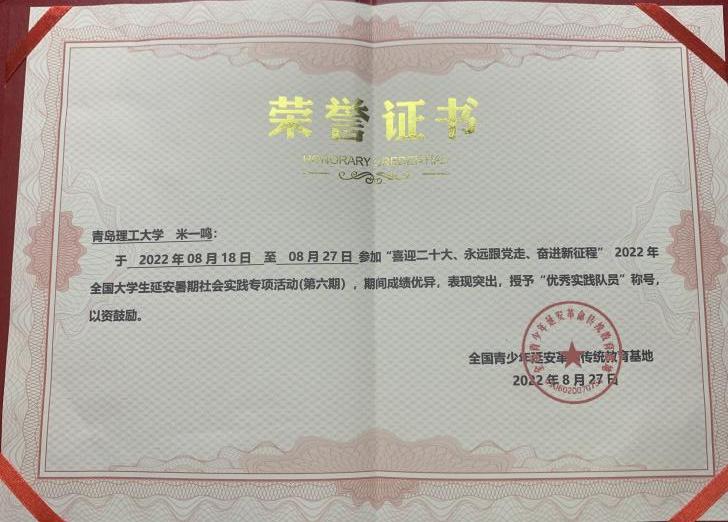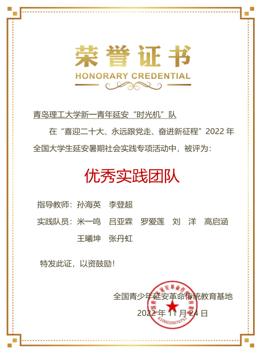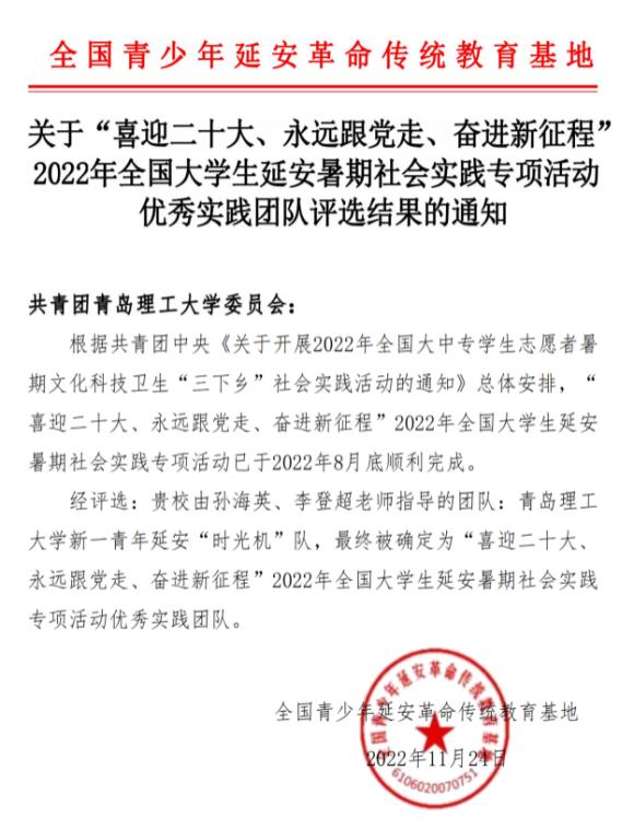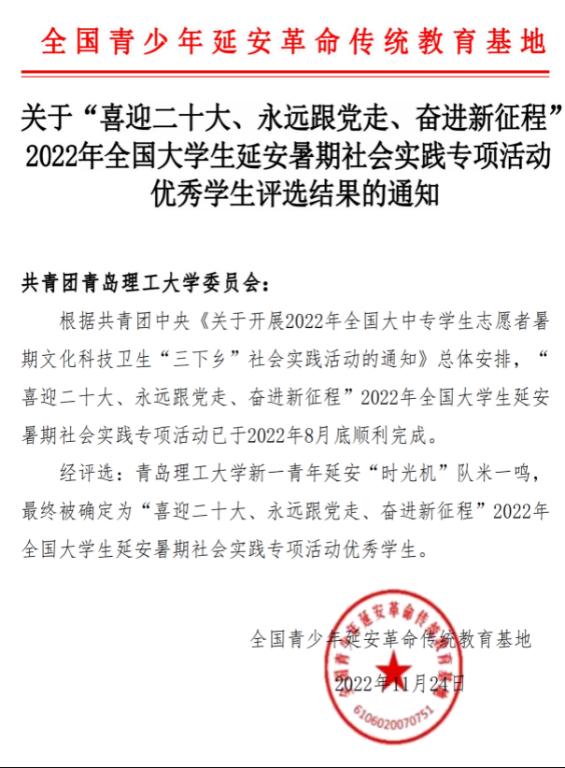 11月24日,根据全国青少年延安革命传统教育基地《关于“喜迎二十大、永远跟党走、奋进新征程”2022年全国大学生延安暑期社会实践专项活动优秀实践团队、优秀学生评选结果的通知》,青岛理工大学新一青年延安“时光机”队,被评为2022年全国大学生延安暑期社会实践专项活动优秀实践团队,其中队员米一鸣被评为2022年全国大学生延安暑期社会实践专项活动优秀学生。