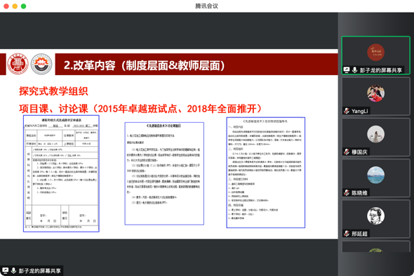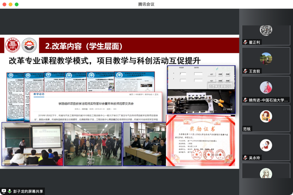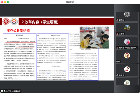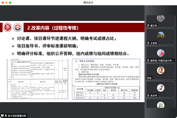 姚传进主任通过在线会议的方式结合石油工程学院的课堂教学改革经验从学院的管理机制、课程群的设置、过程考核的实施举措、专业课构建“大思政”的探索等方面做了分享。
