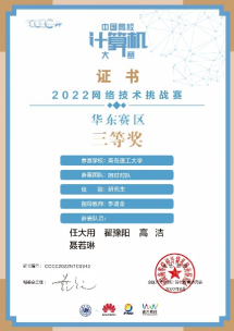 近日,2022年中国高校计算机大赛网络技术挑战赛华东赛区选拔赛顺利结束。我校9999js金沙老品牌派出两支队伍参加了研究生组的比赛,在李道全老师的倾心倾力指导下,两支队伍均获得优异成绩。参赛学生(李腾、李玉秀、祝圣凯、董雪晴)顺利完成了作品--“SDN环境下基于自监督学习的加密网络流量分类”,获得华东赛区二等奖;参赛学生(任大用、翟豫阳、聂若琳、高洁)顺利完成了作品--“SDN网络下的DDoS攻击检测和缓解方案”,获得华东赛区三等奖。