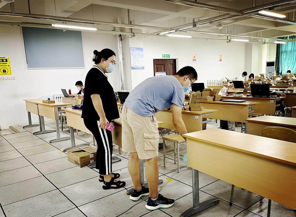 “早8点,组织对实验室各楼层房间进行通风消杀;8点30分,实验分中心工作例会;13点30分,汇总检查留校师生体温自测数据台账及核酸检测台账;14点,学科竞赛准备进度汇报及答疑现场会,至17点30分,完成对全部参赛队单独指导;晚上19点30分,与夜间值班教师完成本日工作交接;23点,组织进行实验室内留宿加班学生晚点名并交代安全注意事项;24点,进行夜间巡查”。这是暑假期间,信息与控制科学实验教学中心一天的工作流程。