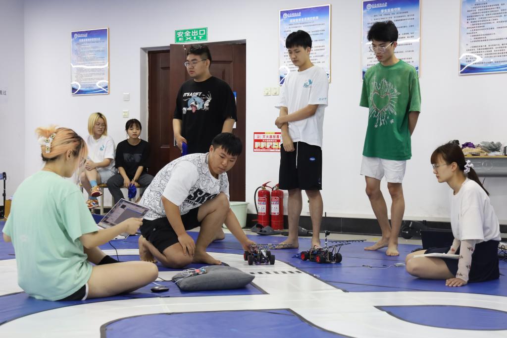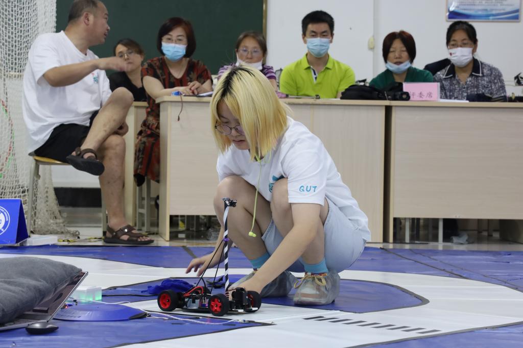 本次校内赛参照正式比赛流程进行,各组参赛队在赛道依次完成指定任务,完成程度和计时时间由场内屏幕和评委现场实时给出,并根据现场成绩进行评分。“这次校内赛不是为了分胜负,而是为了更提升、更突破、更精益求精!”,智能车指导教师团队负责人马淋淋有感而发。针对比赛过程中出现的赛道记忆算法和路径识别等问题,他现场进行分析讲解,并和参赛选手一起找出具体解决思路。比赛过程中,其他指导教师也采取分组负责制,使赛场变成了课堂,充溢着沉浸式探讨和专业学习交流的氛围。