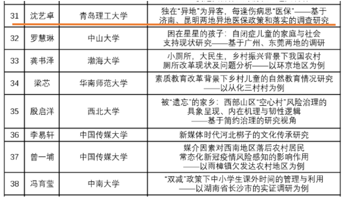 日前,“调研中国”公布2022年百强队伍名单,我校两支队伍从来自清华大学、中山大学、中国人民大学、南京大学、山东大学、厦门大学等高校的四百余支队伍中脱颖而出进入全国百强。(具体如下,排名不分先后)