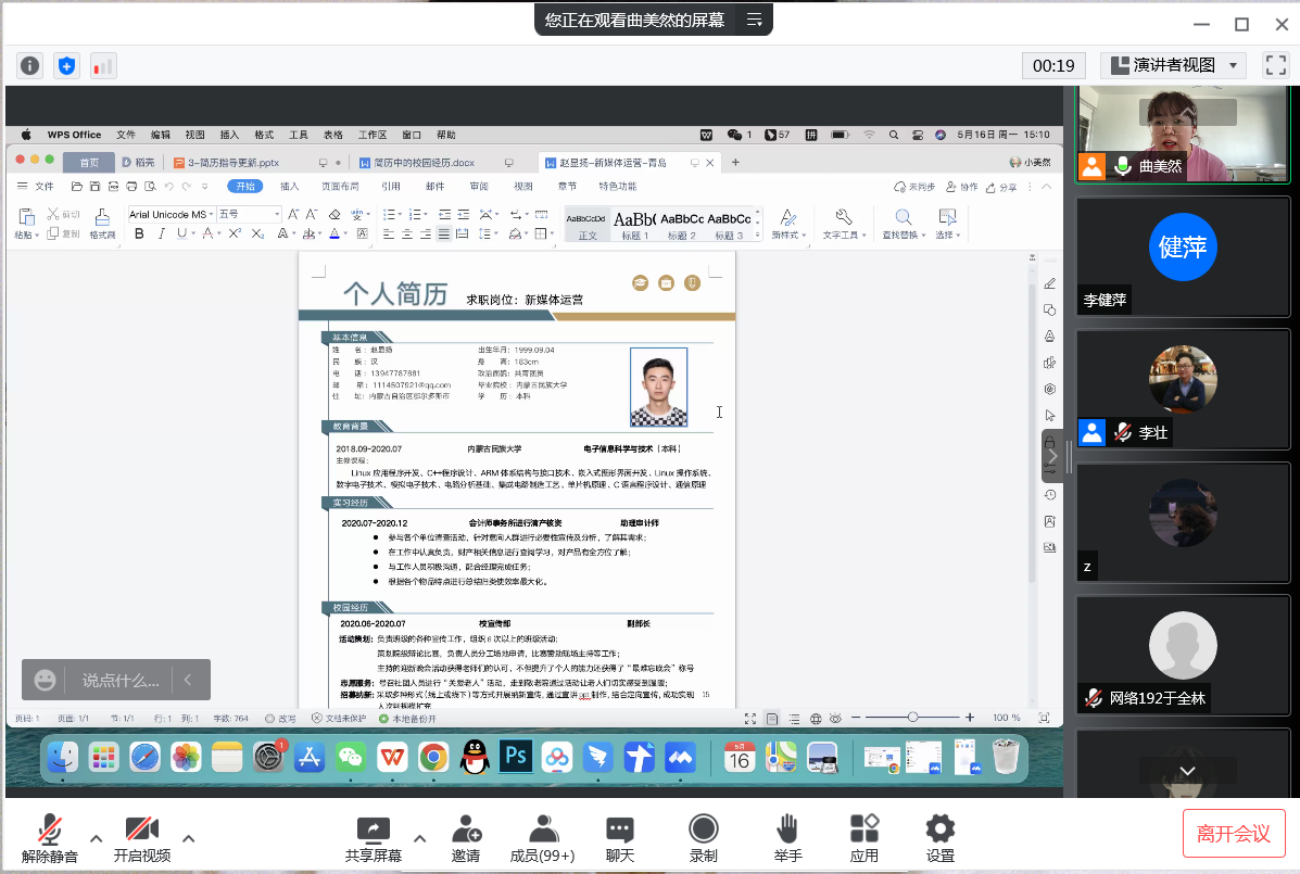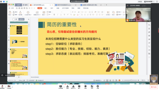 为全力做好疫情防控期间的就业指导工作,提升学生就业竞争力,9999js金沙老品牌频出实招,积极拓宽线上渠道,多举措协同育人促进就业。我院于2022年5月16日下午15点线上举办了“ 关于简历那些事儿”—就业指导专题讲座,助力学生打通求职路上的第一道关口。2018级、2019级学生积极参加,本次讲座特邀青软集团讲师曲美然主讲,软件工程教研室主任李壮、2018级辅导员刘荣稳、2019级辅导员逄超、软件专业驻校校企合作经理李健萍出席了此次活动。