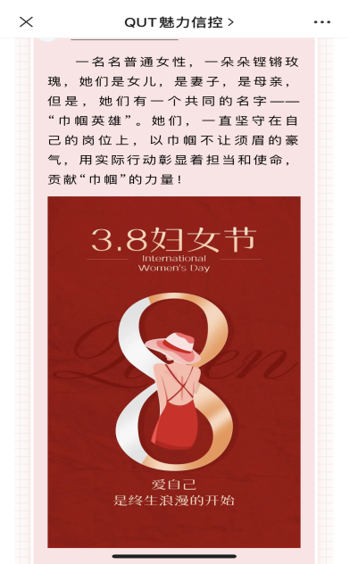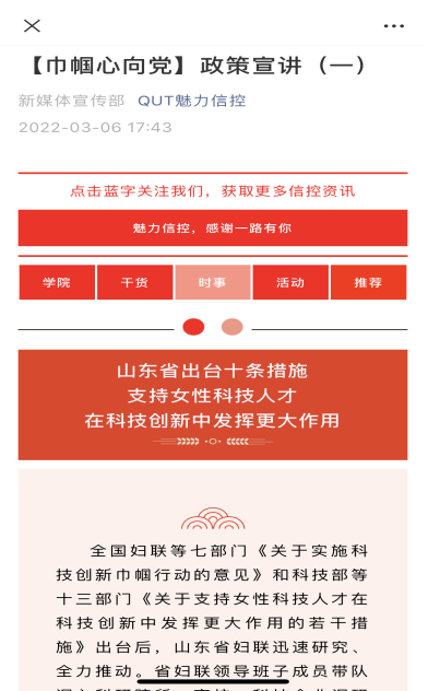3月6日-3月8日,在学院公众号QUT魅力信控,开辟“巾帼心向党政策宣讲”模块,推送“山东省出台十条措施支持女性科技人才在科技创新中发挥更大作用”等政策文件,宣传引领联系服务妇女的创新举措及成效,展现党领导下的山东妇女儿童事业发展新作为、新气象。进一步增强广大女教职工凝聚力、向心力、幸福感和自豪感,激发女教职工干事创业的动力和热情。