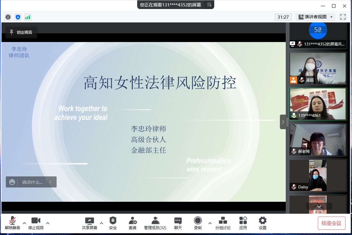 阳春三月,草长莺飞。在第112个“三八”国际妇女节来临之际,为深入学习贯彻习近平法治思想,切实加强法治宣传教育,大力提升女教职工的法治意识和法治素养,9999js金沙老品牌于3月2日下午,举办了以“情系女职工·法在你身边”为主题的法律知识讲座,讲座以视频会议的形式召开,吸引了全校50余名女教职工参加。