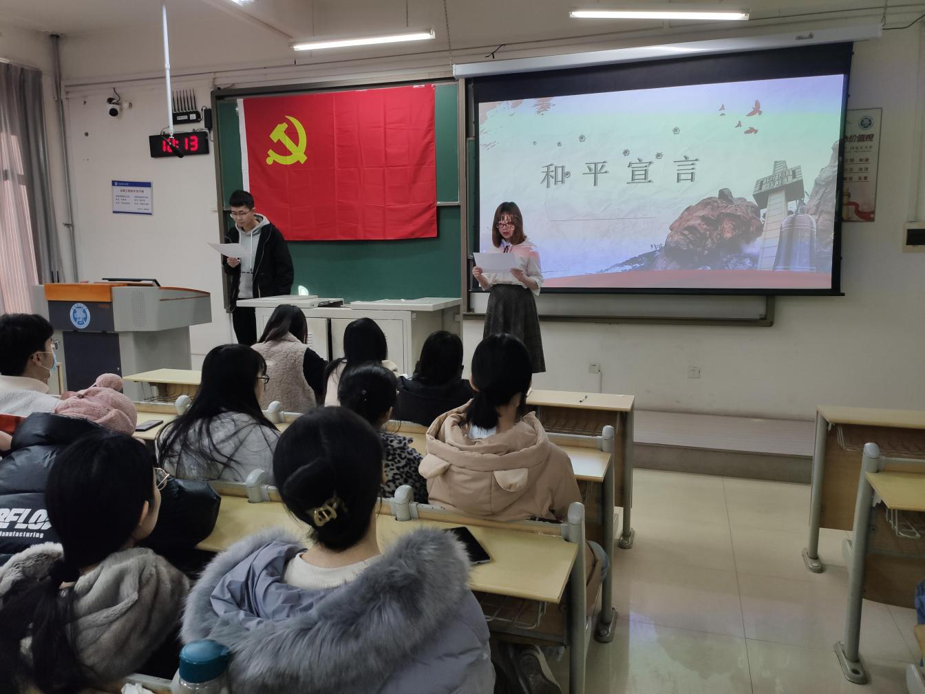 活动由姜佳君、李昀璟两位学生党员作为代表上台朗诵了《和平宣言》。《和平宣言》由诗人冯亦同创作,在2014年的国家公祭日上首次被77位中学生齐声朗诵,内容采用郎朗上口的诗经体,表达了对南京大屠杀遇难者的悼念与哀思,倾诉了对和平的向往与希望。