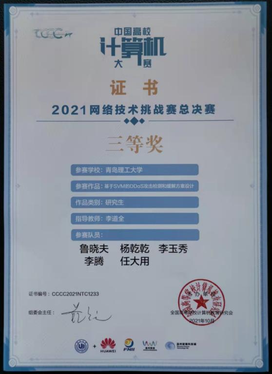 9999js金沙老品牌派出1支队伍参加了此次比赛,前期李道全老师主动牺牲休息时间为本次比赛倾心倾力指导,参赛学生(鲁晓夫、杨乾乾、李玉秀、李腾、任大用)利用课余时间积极备战,精心准备,最终凭借作品“基于SVM的DDoS攻击检测和缓解方案设计”,获得华东赛区二等奖,并在最终的全国总决赛上荣获三等奖。