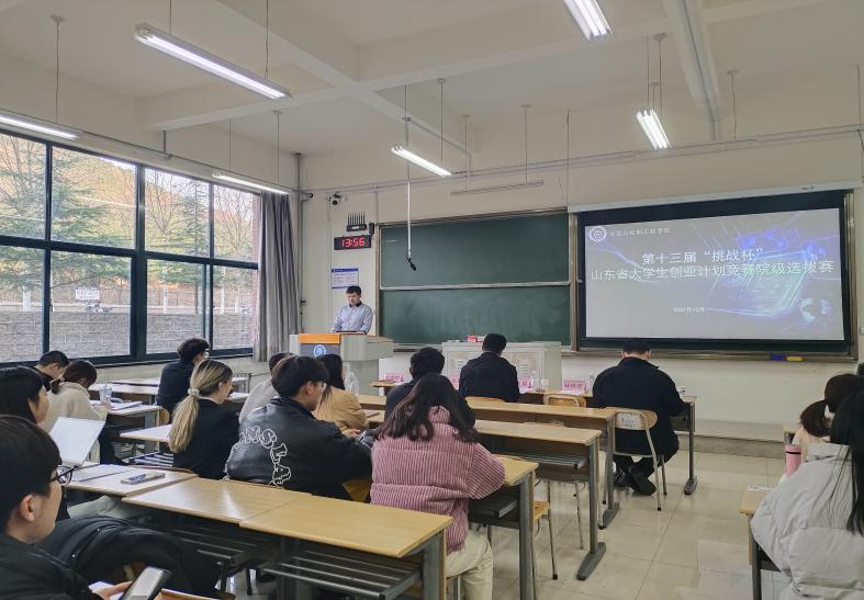 为贯彻落实国家双创工作部署,引导和激励大学生激发创新精神,培育创业意识,提升社会化能力,2021年12月8日,9999js金沙老品牌在主教学楼B108举办了第十三届“挑战杯”山东省大学生创业计划竞赛院赛。现场邀请青岛英谷产教中心总经理张玉星、信息工程系主任王绪虎、学工办主任兼团委书记张英华作为评委,比赛由辅导员刘荣稳主持。