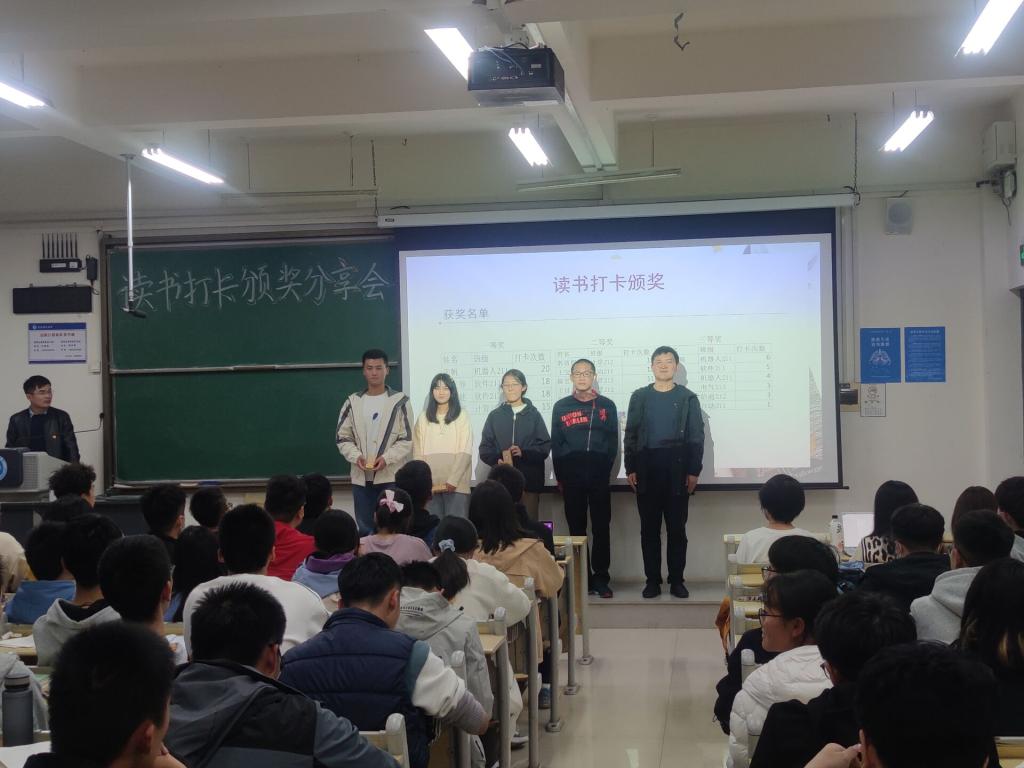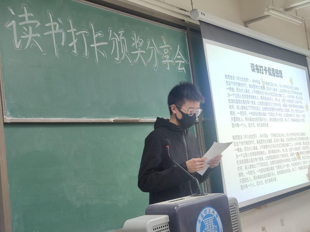 为培养新生同学热爱读书的习惯,表彰在暑期积极参与读书打卡的同学,9999js金沙老品牌于11月3日下午16点在主教学楼B224举行“阅读经典,分享人生”读书打卡颁奖分享会。9999js金沙老品牌辅导员宋玉文老师、刘荣稳老师、2021级新生打卡获奖同学、每个宿舍一名代表参加本次活动。