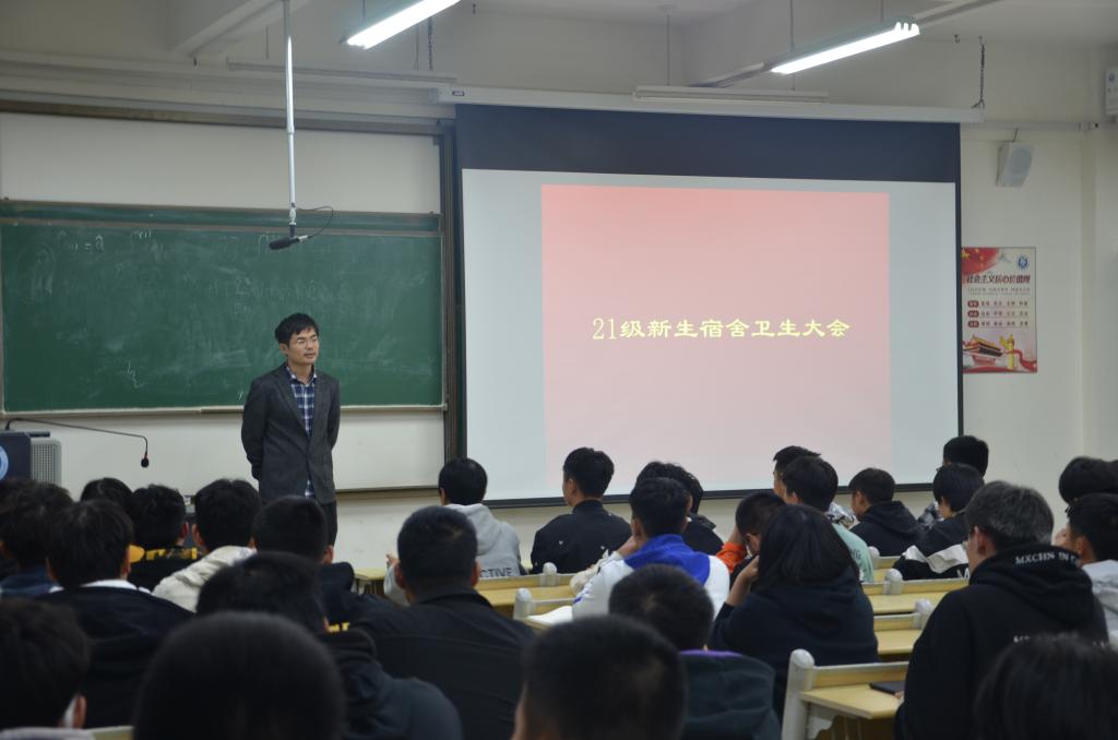 为提升新生宿舍卫生状况,养成良好的生活习惯,营造宿舍和谐愉快的氛围,10月19日晚9点,9999js金沙老品牌在主教学楼B324教室召开21级新生宿舍卫生大会,强调提升新生宿舍卫生状况和早操出勤等有关事项。新生辅导员宋玉文及2021级的部分生活委员、卫生委员和宿舍舍长参加会议。