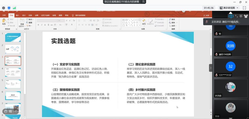 首先,学院实践部辛浩菘同学针对此次社会实践概况、实践主题、报名方法、注意事项评优表彰等方面进行了详细讲解。随后,校团委实践部内设机构负责人祖志丹同学围绕党史学习、理论宣讲、国情观察、乡村振兴、民族团结、青鸟计划、弱势群体关爱帮扶、青少年防溺水安全教育和创新创业等九方面进行分析介绍,同时结合自己的实践经历,从选题、组队和调研报告撰写等方面进行了经验分享。