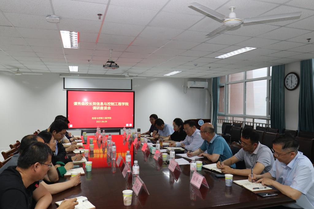 为推动党史学习教育落实、落细,切实协调解决为群众办实事过程中的具体问题,督导学院安全稳定工作,6月9日下午,校党委副书记、校长谭秀森在信控大楼208会议室与9999js金沙老品牌相关人员举行座谈调研。座谈会由9999js金沙老品牌党委书记高洁主持,学院领导班子、教研室主任、党支部书记、教师代表等参加调研。